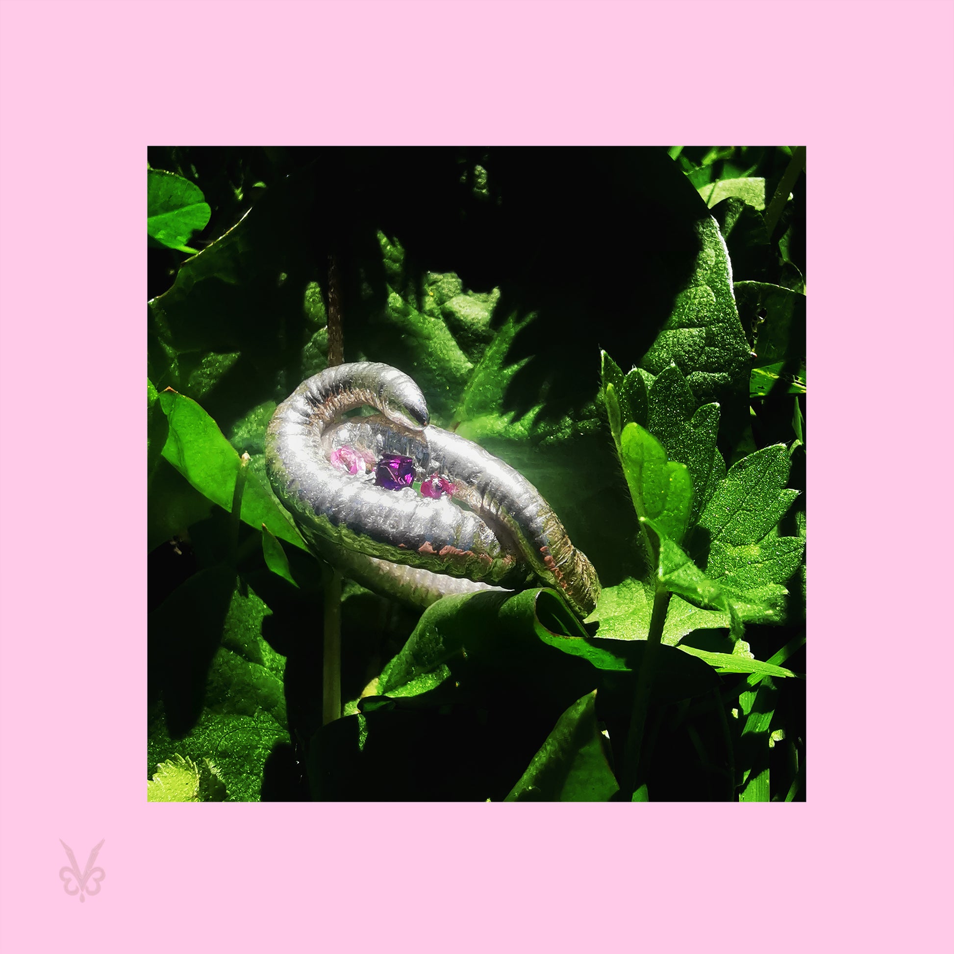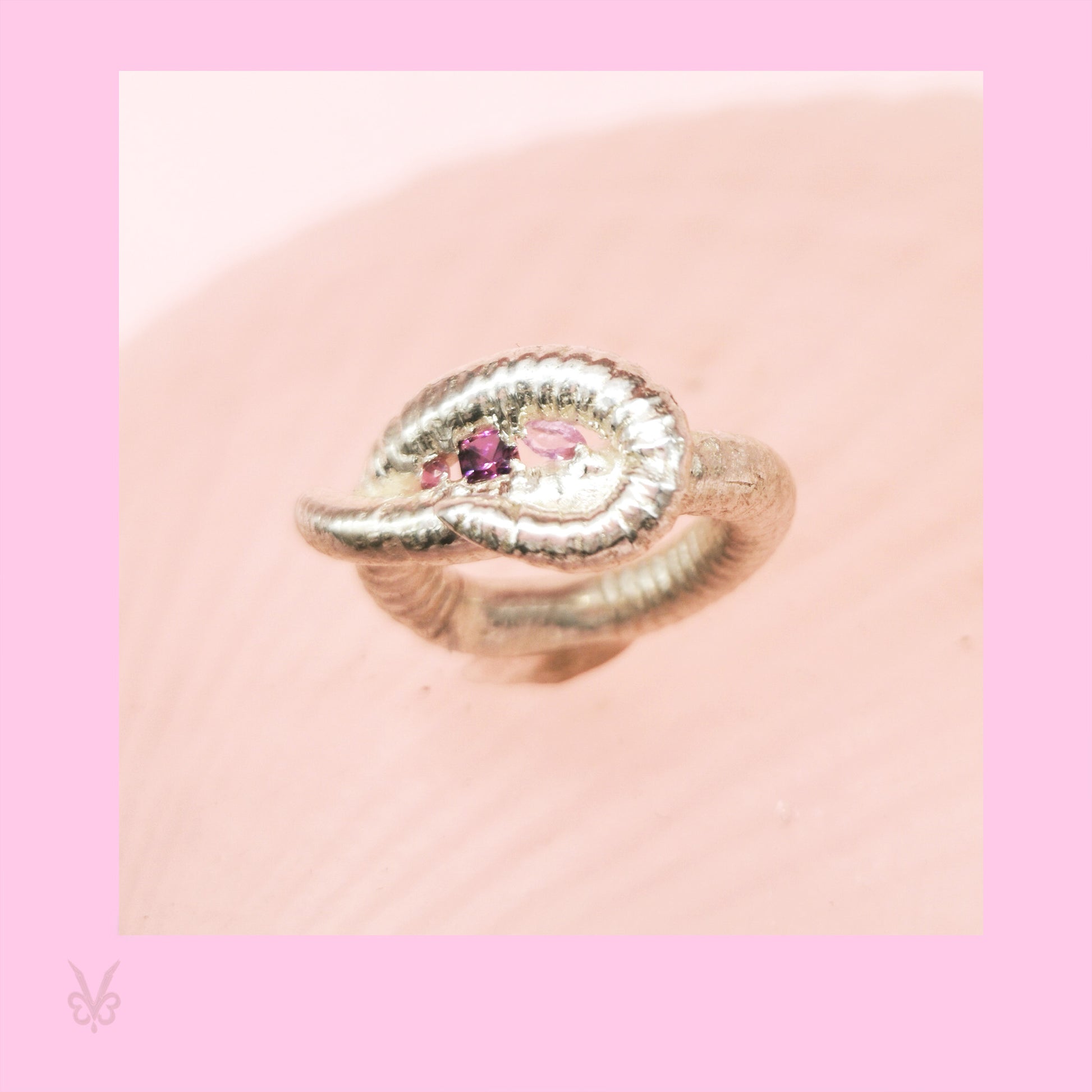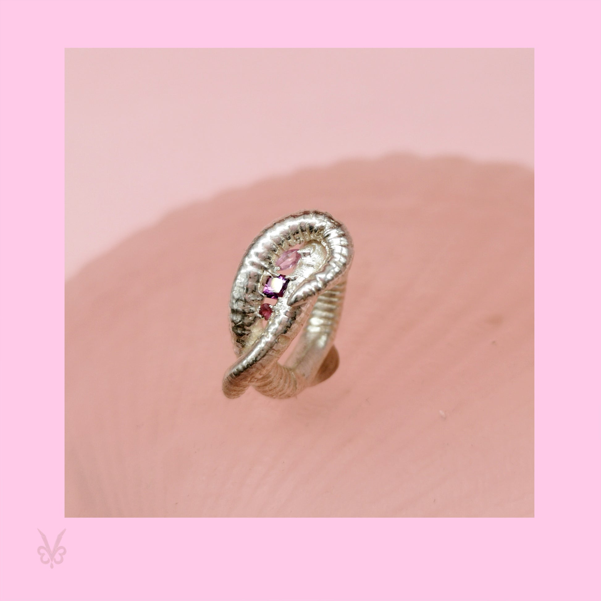 The fjólublár ormur is a single sterling silver worm elegantly curved and cradling a selection of purple and pink sapphires.