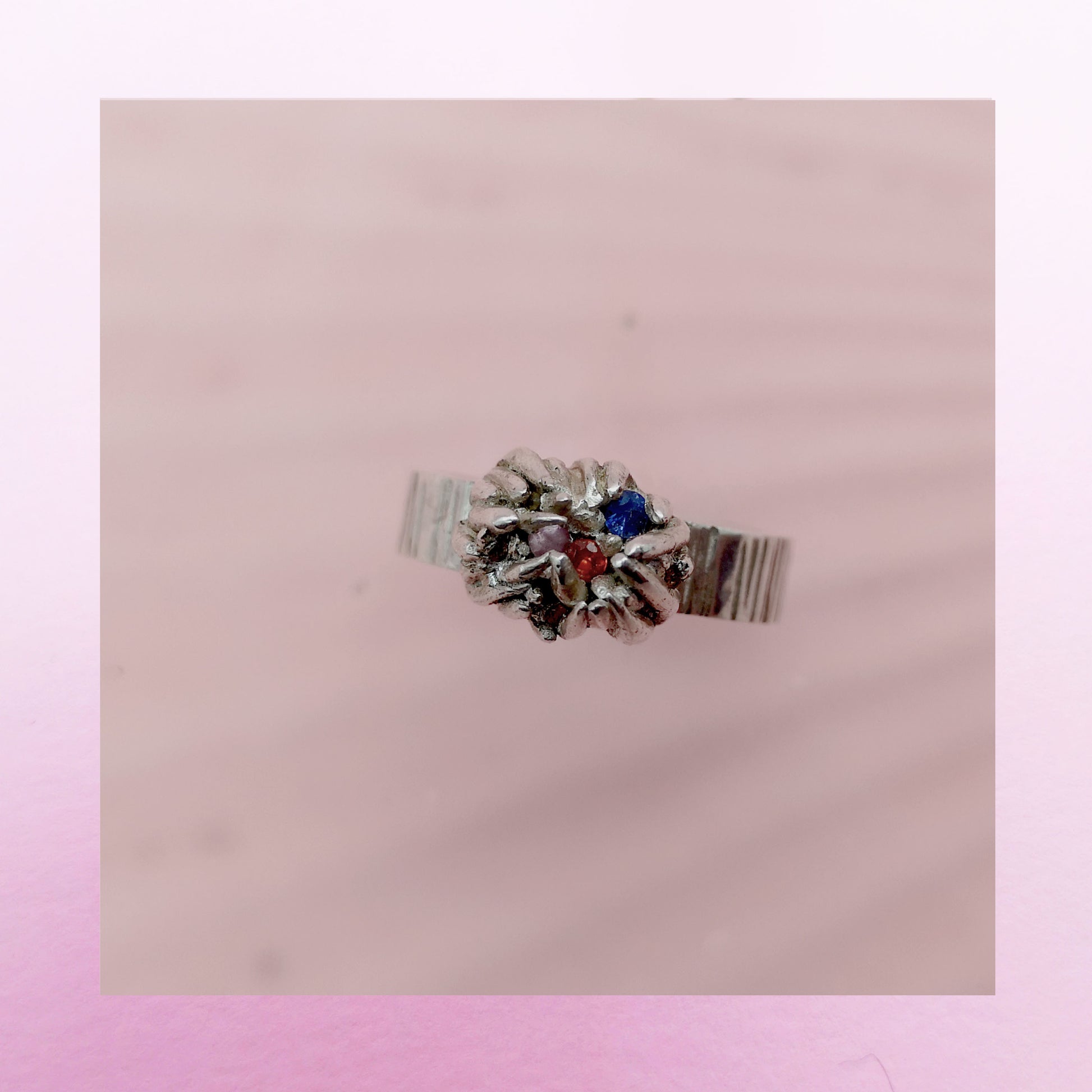 Sterling Silver rings made with a hand textured 1.5 thick silver band and sea anemone cast in with 1mm and 2mm colored sapphires each one unique. Made to order in your finger size.