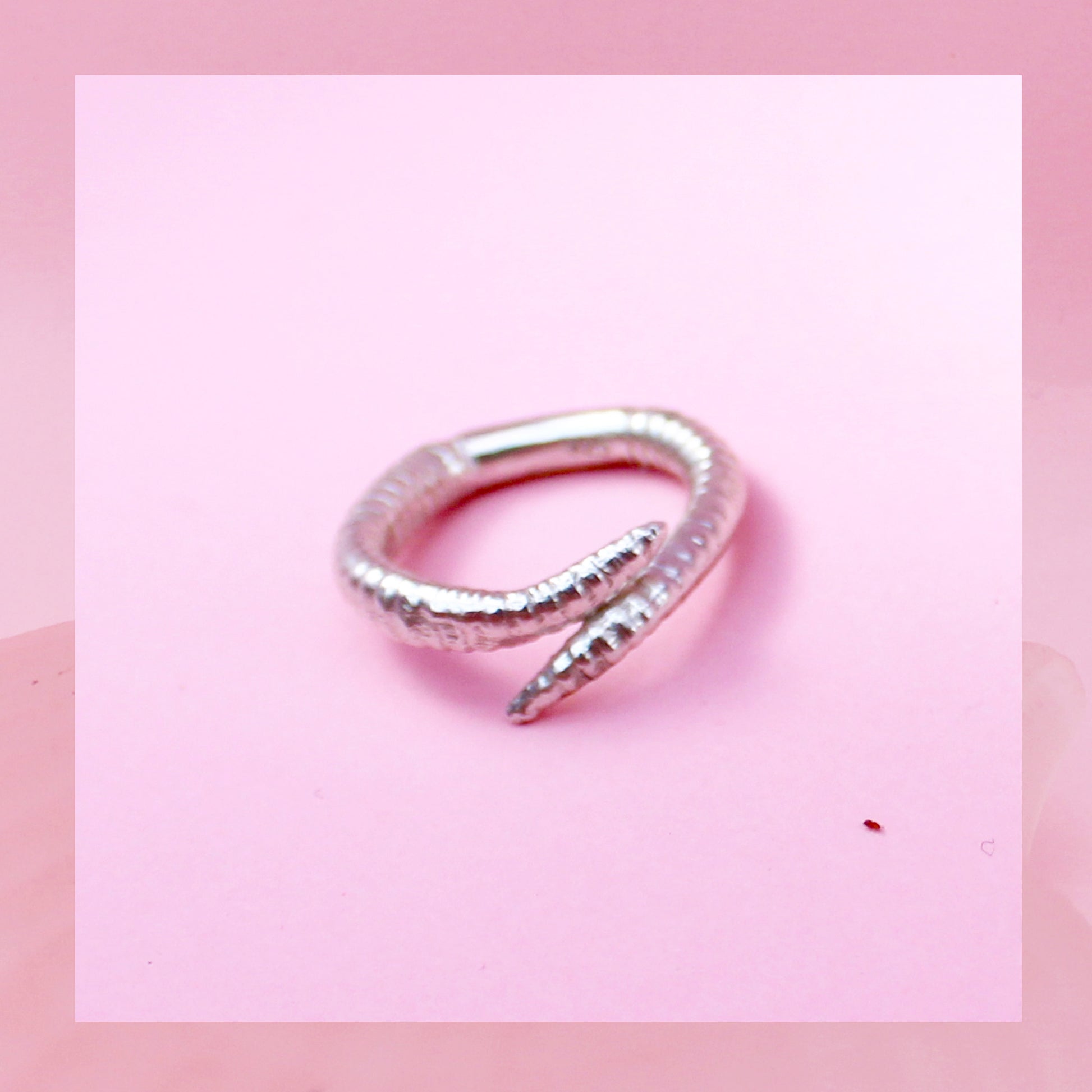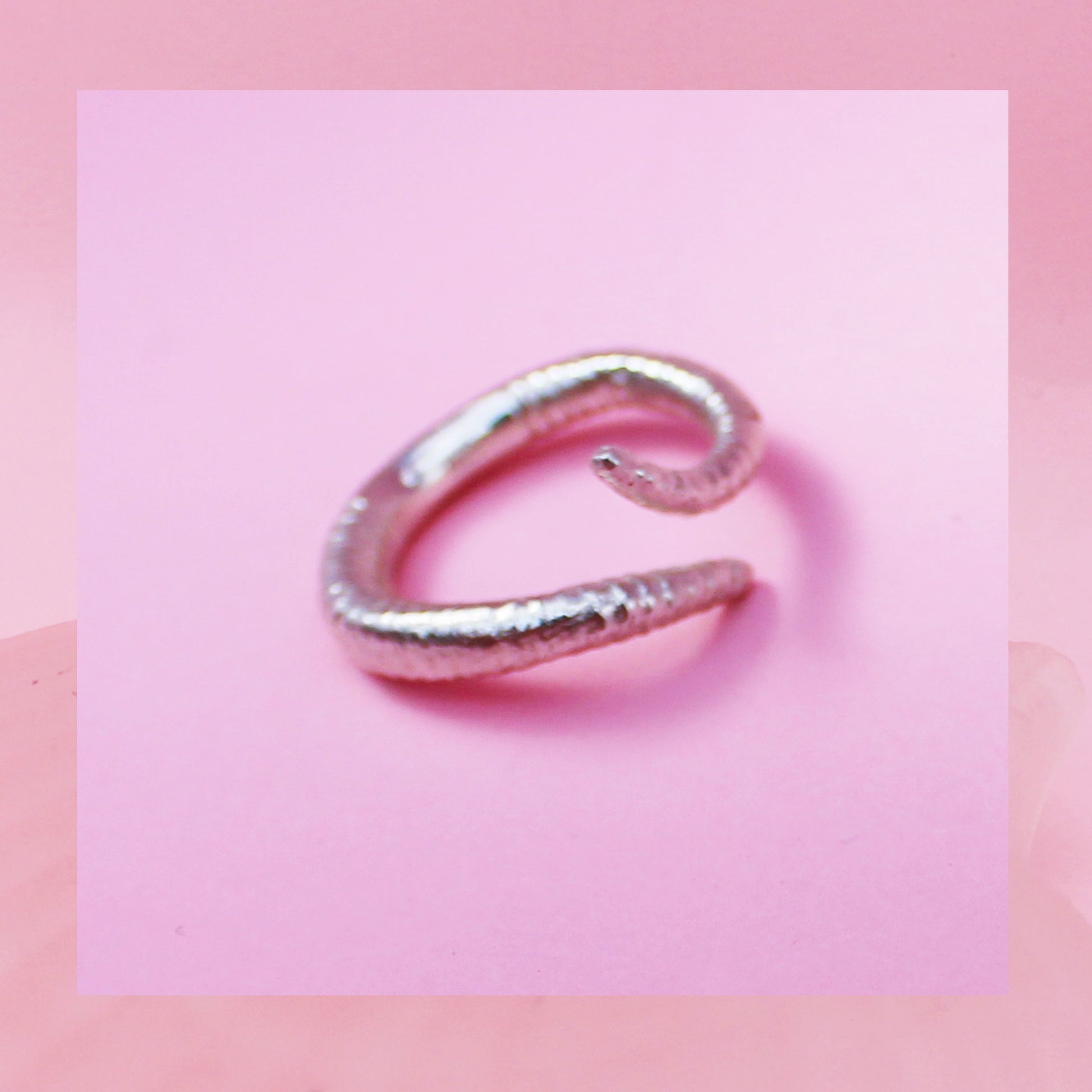 Single sculpted worm in sterling silver. Made to order in your finger size-can be made in gold contact me for a quote.